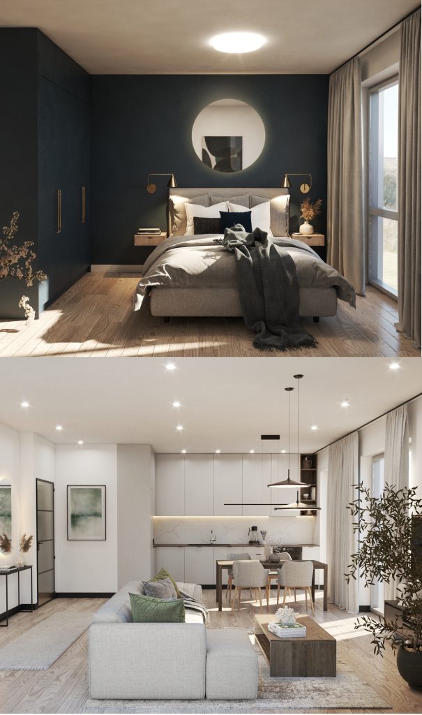 * Strefa community mieszkańców – siłownia, co-working zone, sala gimnastyczna, lokalny dostawca świeżych produktów spożywczych, car sharing i ładowarki do samochodów elektrycznych